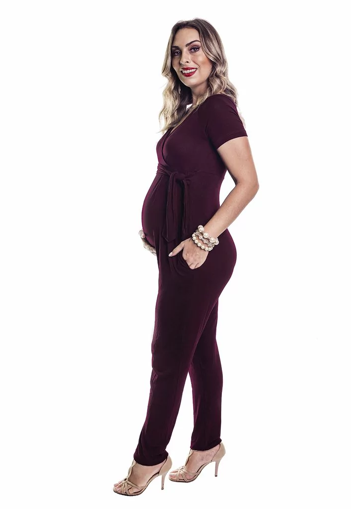O macação gestante é feito em malha leve e possui modelagem transpassada no seio para facilitar a amamentação.A peça possui um lacinho na altura do seio para ser amarrado lateralmente , o que proposciona um toque charmoso no visual. Modelagem da perna skinny.